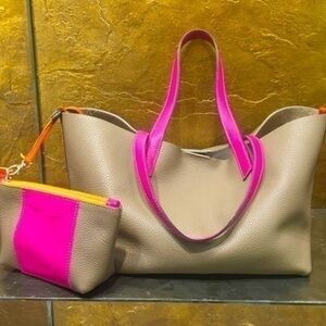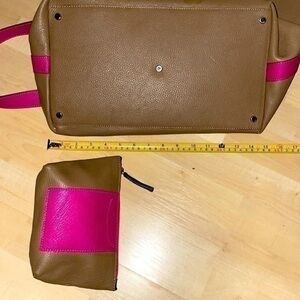 In color block, with small make up bag, inner hidden zip compartment with logo