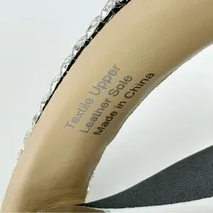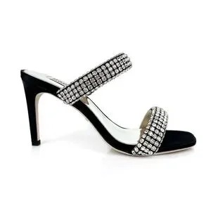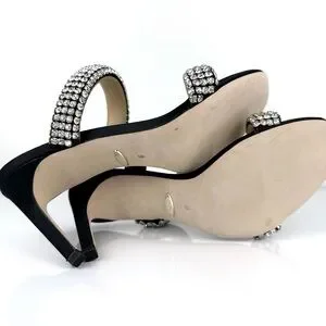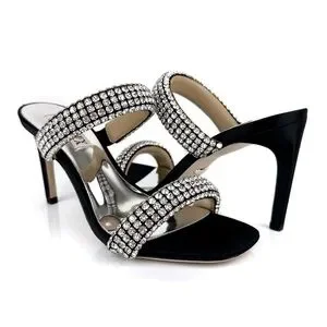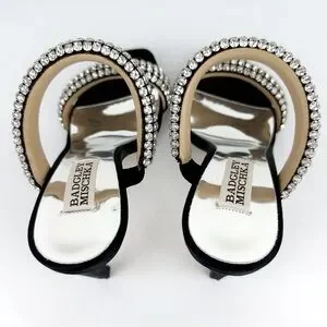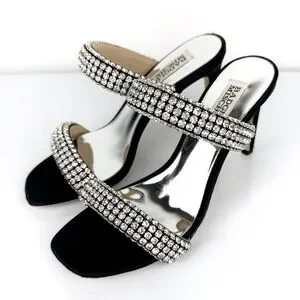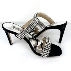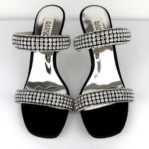 Elevate your style with these stunning Badgley Mischka Sade jeweled double-band heeled sandals, perfect for any formal occasion or party. The slip-on design and sturdy stiletto heel provide both comfort and elegance, while the black textile upper material and rhinestone accents add a touch of glamour.