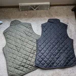 Stylish quilted vests in green and black. Perfect for layering. Selling both together, no rips, no stains.
