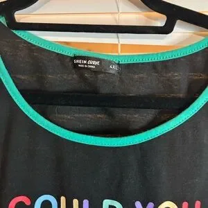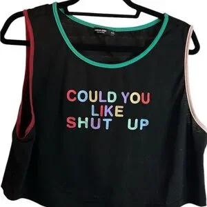 Express yourself with the black crop top featuring vibrant multicolor lettering. Perfect for a bold, casual look.