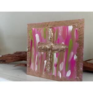 Gold Cross Wood Painting Pink Green Hand Painted Wall Art 5x5 Block Preppy Lilly