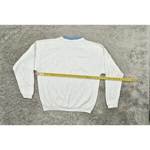 For sale, a gently used Morning Sun women's pullover sweater. This cozy, white cotton piece is perfect for adding a layer of warmth. Size Large (Petite), it has a relaxed pit-to-pit measure of 23 inches and a length of 27 inches, fitting comfortably while offering a casual look. Ideal for various occasions and ready to complement your wardrobe.