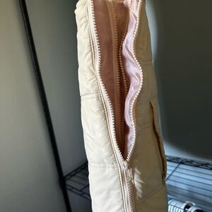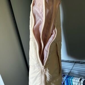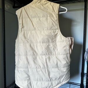 Stylish beige quilted vest with a high collar and zip closure. Perfect for layering.