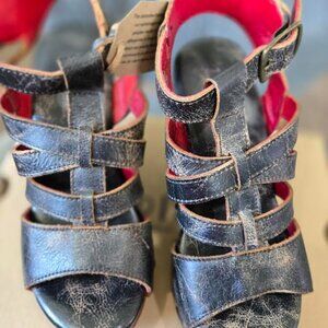 Bed Stu Dalu black women's size 6. Genuine organic leather. Distressed leather. Padded footbed for added comfort. 4.5 inch wedge heel. Buckle strap.