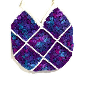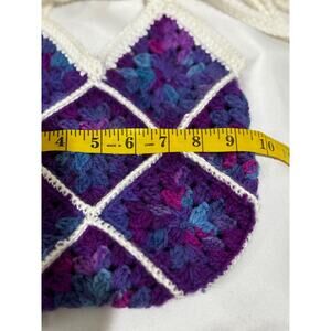 Vintage Crochet Granny Squares Purple & Blue Flowers HandBag purse hippie bohoHandmade This vintage crochet granny squares handbag purse features a unique floral pattern in shades of purple and blue, perfect for a hippie or boho style. The small size and lightweight design make it easy to carry around, while the white handle adds a touch of contrast. Handmade with acrylic material, this sling bag is both stylish and functional, ideal for women looking to add a pop of color to their outfit while embracing a retro vibe.