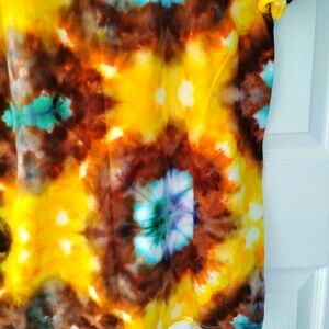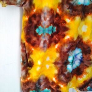 Colorful tie-dye t-shirt with a mix of yellow, brown, and blue patterns. Perfect for a bold, casual look. Tie dyed by me using a new George men's size large T-shirt.