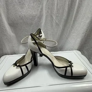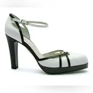 Step out in style with these elegant black and white women's heels. Perfect for any occasion, these shoes offer a chic and sophisticated look. Mary Jane style with ankle strap. Size 9.5.