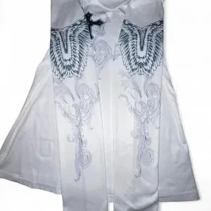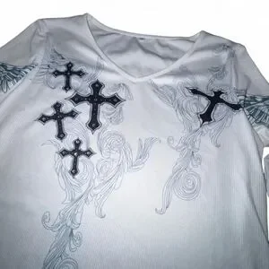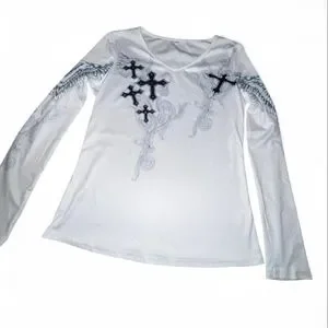 Beautiful white long sleeve top featuring a striking cross design and angels. Perfect for adding a touch of style to any outfit. New