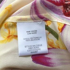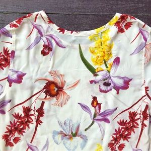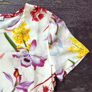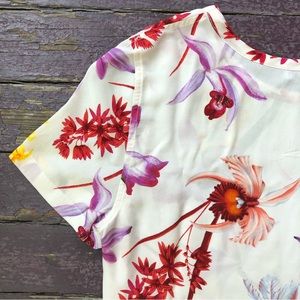 Gorgeous 100% silk Riley Tee from Equipment. Endangered Floral Print, which is made up of vibrant red, pink, yellow, and white flowers on a white background. Slightly longer in the back (high low cut). Shirttail hem, scoop neck, short sleeves. Slightly translucent fabric. One tiny dark spot as shown (I have not tried to stain treat), otherwise perfect. Size XS, but is oversized and would definitely fit a small or medium as well, depending how you want it to fit.
