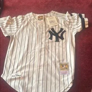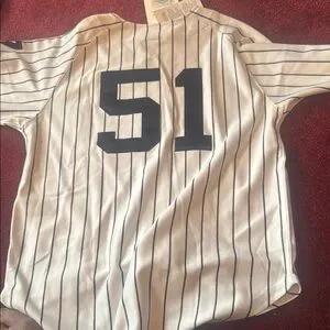 Stylish kids baseball jersey with classic pinstripes. Features bold black logo on white fabric. Ideal for young fans.