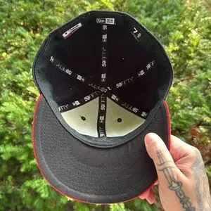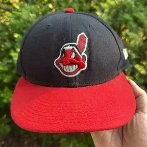 Early 2000’s Cleveland Indians Chief Wahoo Fitted Baseball Hat in size 7-5/8ths. 8/10 condition. Official On-Field Cap w/ black underbrim.