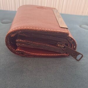 Elegant cognac leather wallet by Patricia Nash. Features a chic metal bar and embossed floral detail. Lots of pockets and card holders. Gently used, excellent condition! Couple of small scratches on metal clasp, pictured.