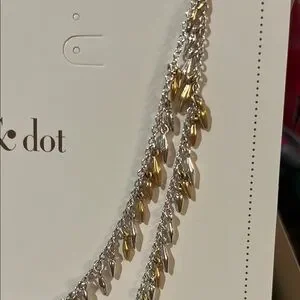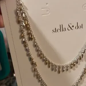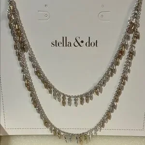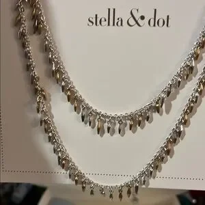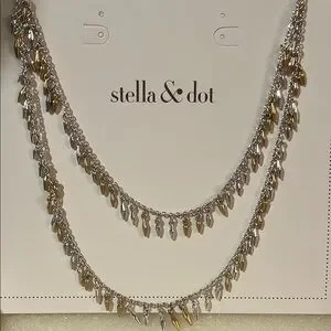 Discover the elegance of Stella & Dot's vintage-inspired necklace, featuring a harmonious blend of gold and silver tones. This delicate piece showcases small teardrop charms and sparkling accents, perfect for adding a touch of sophistication to any ensemble. Never worn. New condition.