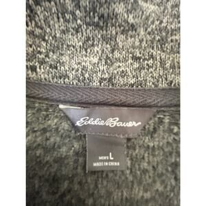 Very nice gray fleece sweater with snap front, gray trim, and Eddie Bauer logo.