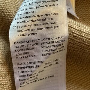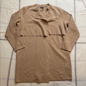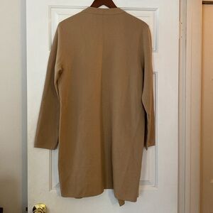 Basler long cardigan sweater in a neutral tan/beige color. Features an open front design with wide collar and storm flaps to give it a "trench coat" look. Belt loops but missing its belt. Very sophisticated and stylish.