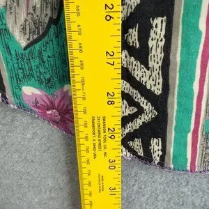 • Color & Pattern: Multicolor — dominant purple, black, green, and white in a vertical striped layout featuring hibiscus flowers and geometric Aztec elements