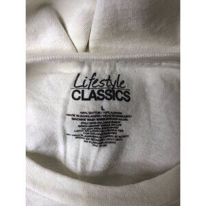 The product is a men's regular fit T-shirt from Life Style Classics, featuring a graphic print design with a cowboy theme. The shirt is made of cotton in size Large, with short sleeves and a off white color.
