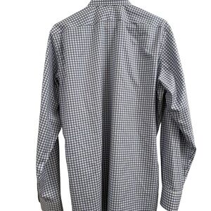 This dress shirt features a classic gingham pattern in blue and white, perfect for professional or semi-formal settings. Made from a crisp cotton or cotton-blend fabric, it offers a structured and polished look. The shirt's long sleeves and traditional point collar add to its timeless appeal.