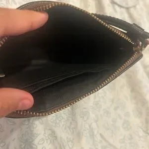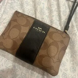 Elegant Coach pouch in brown with black accents. Features iconic logo pattern.
