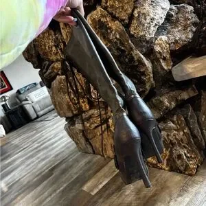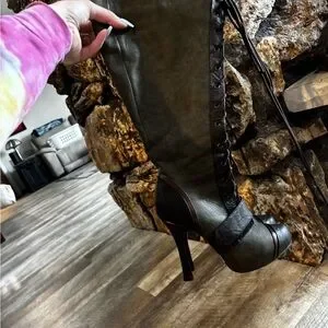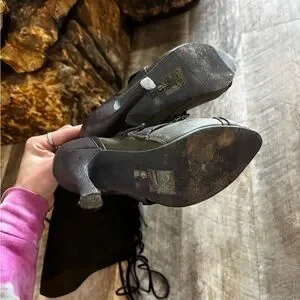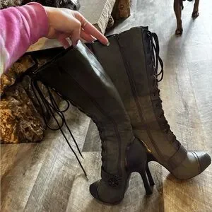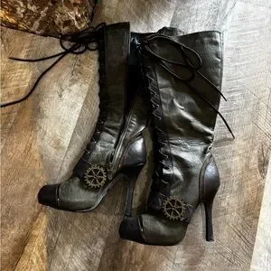 Stylish lace-up boots with high heels. Dark green leather with unique gear detail. Perfect for bold fashion statements.