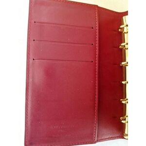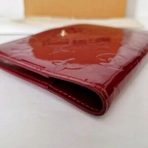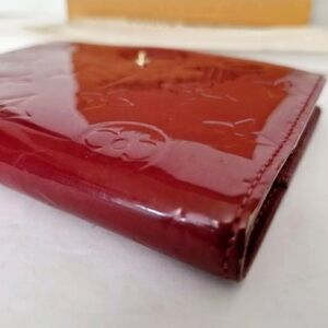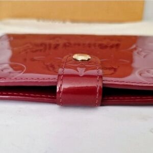 Elegant red bag with iconic monogram design. Features a secure snap closure.