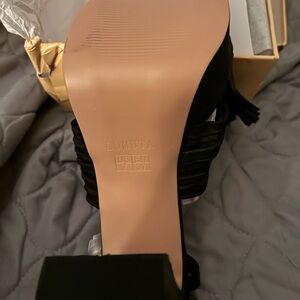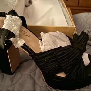 Step into elegance with these black platform sandals, featuring a chic knotted design on the front strap. The high heel and platform add height and comfort, perfect for formal occasions. Crafted from luxurious satin-like material, these sandals blend vintage charm with modern style.