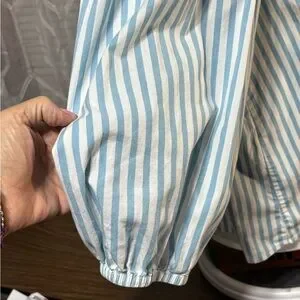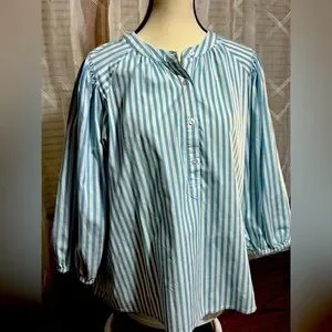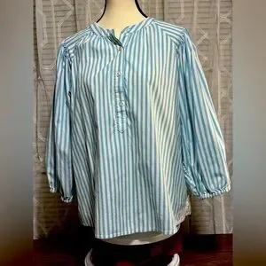 A New Day sz large Blue and White Striped button front 1/3 Blouse 26” L 22” p2p puffed sleeves