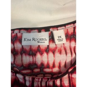 The Kim Rogers blouse in size 2XL features a multicolor geometric pattern and a boat neckline. It is made from soft, stretchy material and includes 3/4 sleeves with lace accents. Designed for women, this regular fit blouse is pre-owned. Keywords: Kim Rogers, 2XL, multicolor, blouse, women's clothing, geometric pattern, boat neck, 3/4 sleeve, lace accents, stretchy material, regular fit, pre-owned, women's fashion, soft fabric.