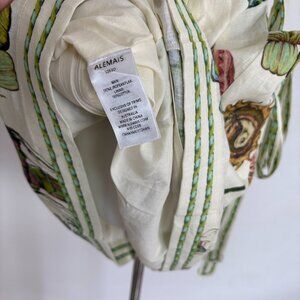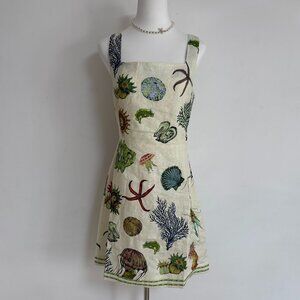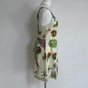 The Alemais sundress is a chic resort wear piece, featuring a sleeveless design with a stylish one-shoulder neckline. Crafted in a refreshing cream and green palette, this mini dress offers a breezy and casual vibe perfect for warm weather getaways. Its playful silhouette and vibrant colors make it an ideal choice for a relaxed yet fashionable look.