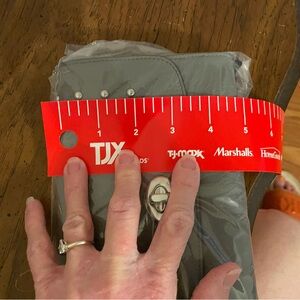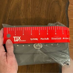 This elegant Coach wristlet showcases a refined gray pebbled leather design, accented with silver-tone studs for a modern touch. Featuring a signature turnlock closure and a detachable wristlet strap, it offers both style and versatility for any occasion.