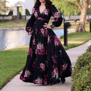 Trashy Diva Floral Maxi Dress in the color Black and pink. V neckline, long sleeve, maxi length. Heavy weight fabric. All over floral print. Size 12, womens. In great pre-worn condition. No materials tag. Super cute for your next party, formal, special occasion, vacation, resortwear.