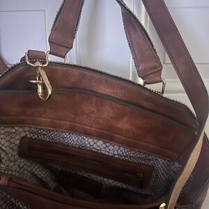 Elegant dark brown tote by Steve Madden. Features dual handles and adjustable shoulder strap.