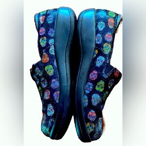 Alegria slip-on shoes with a vibrant multicolor dot design. Features a comfortable fit and stylish look.