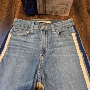 Stylish skinny jeans by Joe's Jeans. Features blue denim with tan and navy side stripes. Perfect for a chic look.