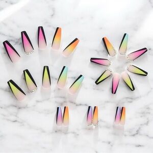 Stunning ombre nail art featuring vibrant colors and rhinestone accents. Perfect for a bold and stylish look. Includes 24 nails, nail filer, and sticky tabs.