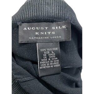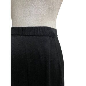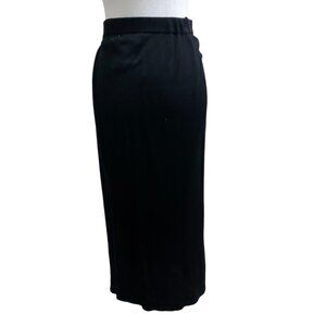 100% pure silk knit maxi skirt by August Silk Knits. This black skirt drapes beautifully, offering comfort and timeless elegance. Features a ribbed elastic waist and a subtle side slit. A versatile, essential piece for any wardrobe, perfect for year-round wear. Excellent pre-owned condition.