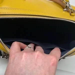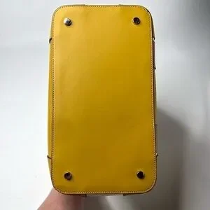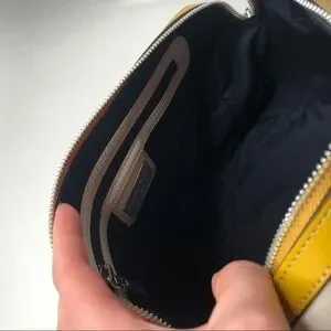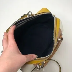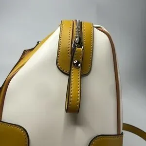 **Faint large “circle stains” that you see are spots on my camera, NOT the bag** NEW WITH OUT TAGS (plastic tag loop) Claudia Firenze two-way carrying mid-sized satchel handbag in a rich mustard yellow, white & tan color-block pattern. Genuine leather. Made in Italy. Silver metal accents including feet studs. Such a funky 70s vibe with the colors. Zippered pocket inside. Removable strap. Excellent like new condition with only one flaw; small indent on tan stripe (see pic pointing to it).