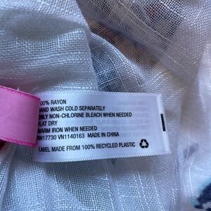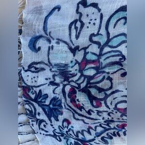 Description: Super soft white scarf/wrap with blue and pink beachy patterns.