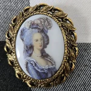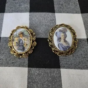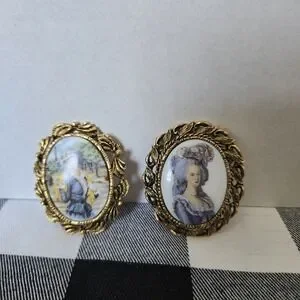 This lot includes two Victorian-inspired brooches featuring female subjects. The frames of the brooches are gold tone metal, adding a touch of elegance to the jewelry pieces. The oval shape and multicolor design of the brooches make them a stylish accessory for women looking to add a vintage flair to their outfits.