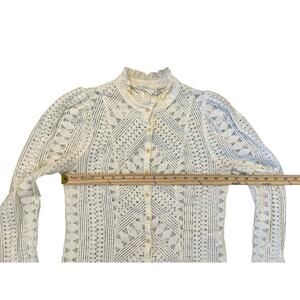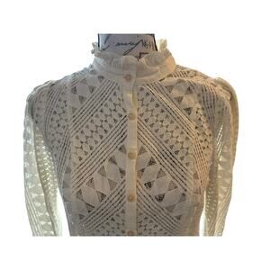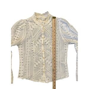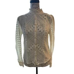This By Anthropologie ivory lace blouse is a romantic, vintage-inspired piece featuring intricate geometric lace, a high ruffle neckline, and elegant long sleeves with subtle puff shoulders. Fully sheer with a button-down front and delicate pleated detailing, this top pairs beautifully with trousers, jeans, or layered under a dress.
