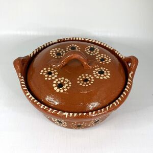 Primitive Covered Dish Tonala Terracotta Lid Hand Painted Mexico Rustic Vintage Measures approx. 7.5” in diameter x 3” tall w/o lid No chips or cracks (see photos for details)