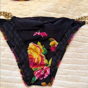 Stylish bikini featuring a vibrant floral and leopard print. Accented with a gold chain detail.