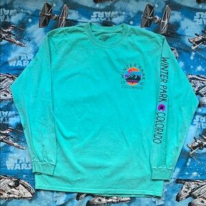 Teal long sleeve tee with vibrant mountain graphic. Features bold colors and Winter Park Colorado design.