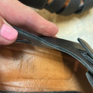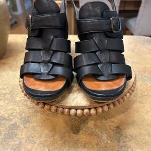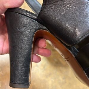 Step out in style with these elegant black heeled sandals. Perfect for any occasion, these shoes offer both comfort and sophistication. High quality designer shoes. Size 41(8). Heel have indentations, but that is normal effect. Heel 4.5”