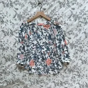 Chic floral blouse by LOFT. Features blue and pink floral pattern. Perfect for casual outings.