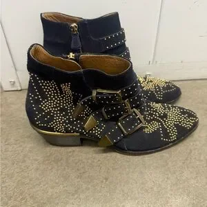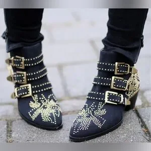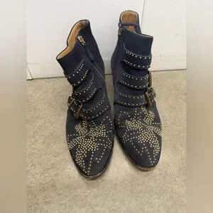 Elevate your wardrobe with these iconic Chloé Susanna boots, crafted in rich navy suede and adorned with eye-catching gold-tone studs in the brand’s signature starburst motif. Featuring three bold buckle straps and a low stacked heel, these boots perfectly balance edgy sophistication and timeless French design.