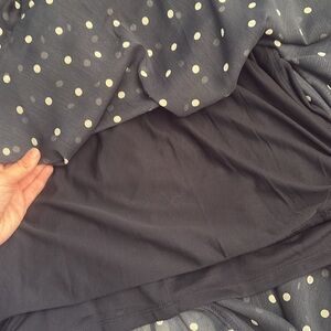 Navy blue and white polka dot dress from Tommy Hilfiger. It is size 4P. In great shape! Only work 1 time to a wedding. It is light material with a slip inside. Zips up the back. The sleeves are cuffed. Super cute dress!! I love it I just can’t fit into it anymore!