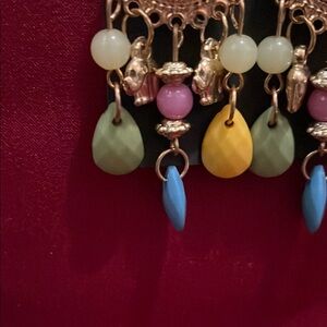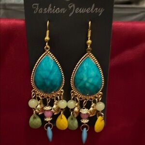 These exquisite Fashion Jewelry earrings feature a captivating blend of blue and gold, showcasing a bohemian-inspired design. The teardrop-shaped blue stones are elegantly set in a gold-toned frame, adorned with intricate beaded detailing. Multiple dangling charms and beads add a playful touch, making these earrings a standout accessory for any occasion.