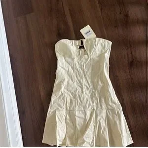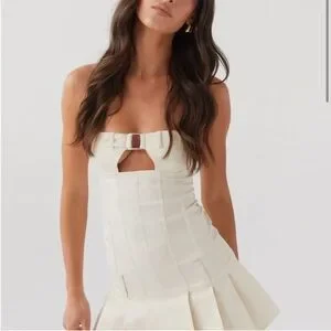 This chic bodycon mini dress by Peppermayo features a sophisticated cream color and a flattering sweetheart neckline. The sleeveless design and pleated skirt add a playful touch, making it perfect for a cocktail night out. The structured fabric ensures a sleek silhouette, while the cutout detail at the center chest adds a modern flair.