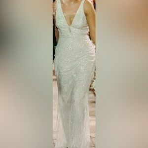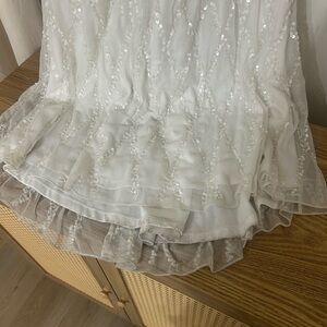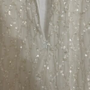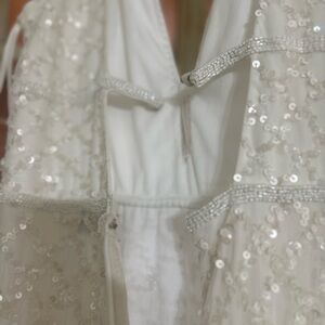 Chic white dress with elegant embellishments. No disclaimers. Ideal for formal events (prom, wedding, reception dress). Worn once. Bottom would need to be dry cleaned. Price reflects. Ton of compliments